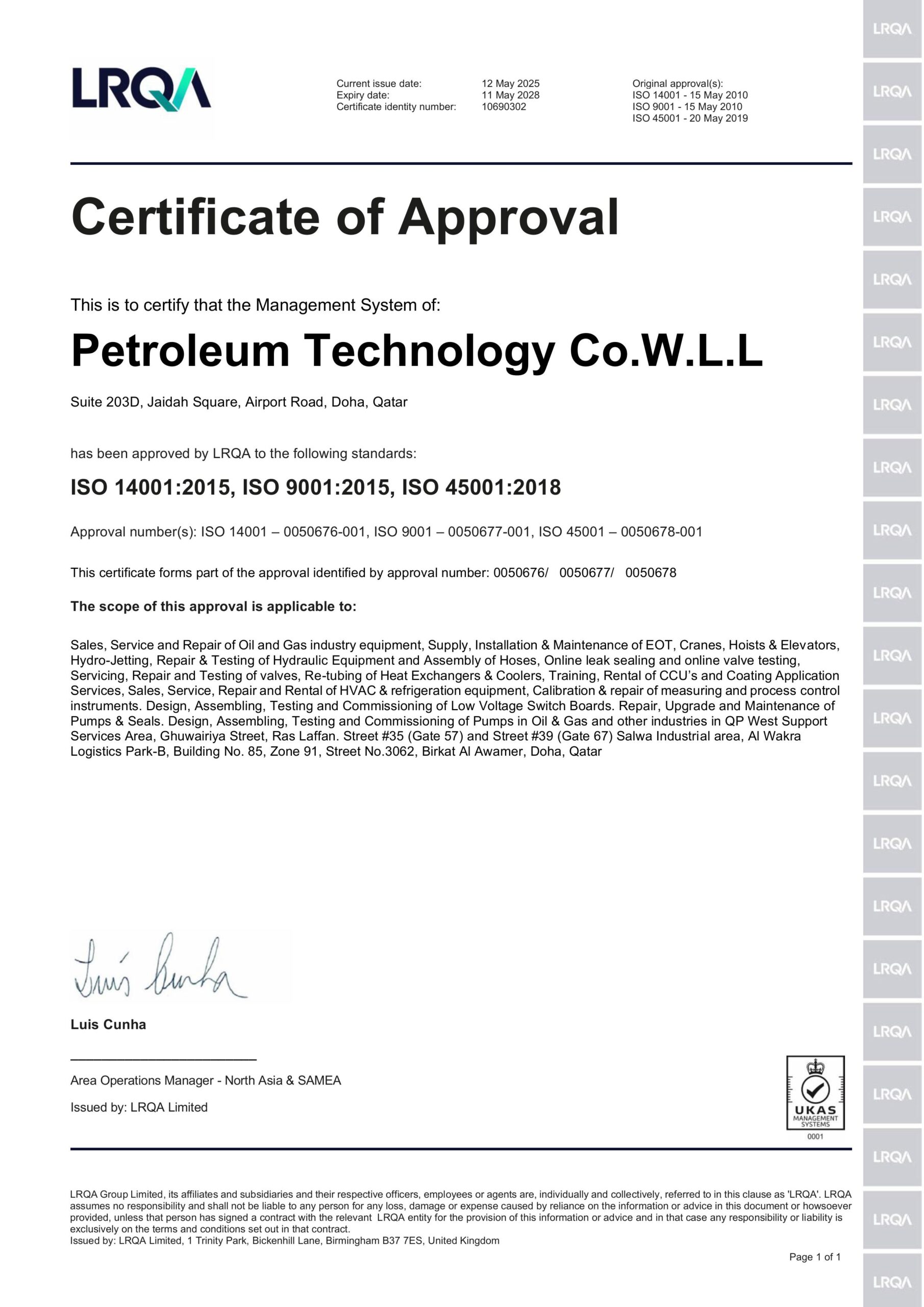 Quality Health, Safety, Security, and Environment are core values for Petroleum Technology Company W.L.L. (Petrotec).